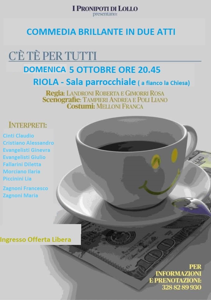 Il messaggio che ci è arrivato diceva: chi non avesse visto una delle due commedie dei “Pronipoti di Loll” della parrocchia di Porretta o chi volesse vederla di nuovo può venire domani sera a Riola.