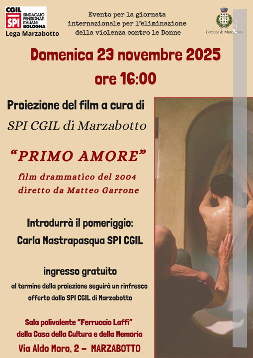 Domenica 23 novembre alle 16:30 c’è la proiezione del film “Primo Amore” di M. Garrone, organizzata da SPI CGIL Marzabotto.