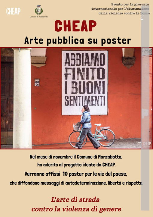 Da lunedì 17 per tutto il mese, per le vie del paese troverete i poster della campagna “CHEAP” contro la violenza di genere. A questa campagna, oltre a Marzabotto, hanno aderito i comuni di Monzuno, Grizzana Morandi, Castel di Casio, Castel d’Aiano, Camugnano, Gaggio Montano, Lizzano in Belvedere, Vergato, Castiglione dei Pepoli.