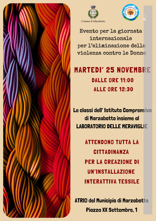 Martedì 25, dalle 11:00 alle 12:30, nell’atrio del municipio sarà allestita un’installazione tessile interattiva realizzata dagli studenti dell’Istituto Comprensivo insieme al Laboratorio delle Meraviglie.