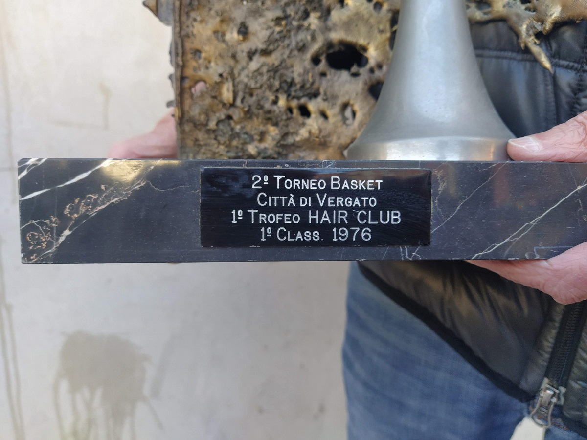 Emerso da una cantina in quel della Carbona, il trofeo del 2° Torneo Basket Città di Vergato – 1° Trofeo HAIR CLUB – 1° Class.1976, nelle mani di uno dei protagonisti del tempo, Bruno Valorosi che lo riabbraccia… manca il vocio dei partecipanti per ricreare un tempo dove le notizie riempivano il negozio del barbiere di via Roma.
