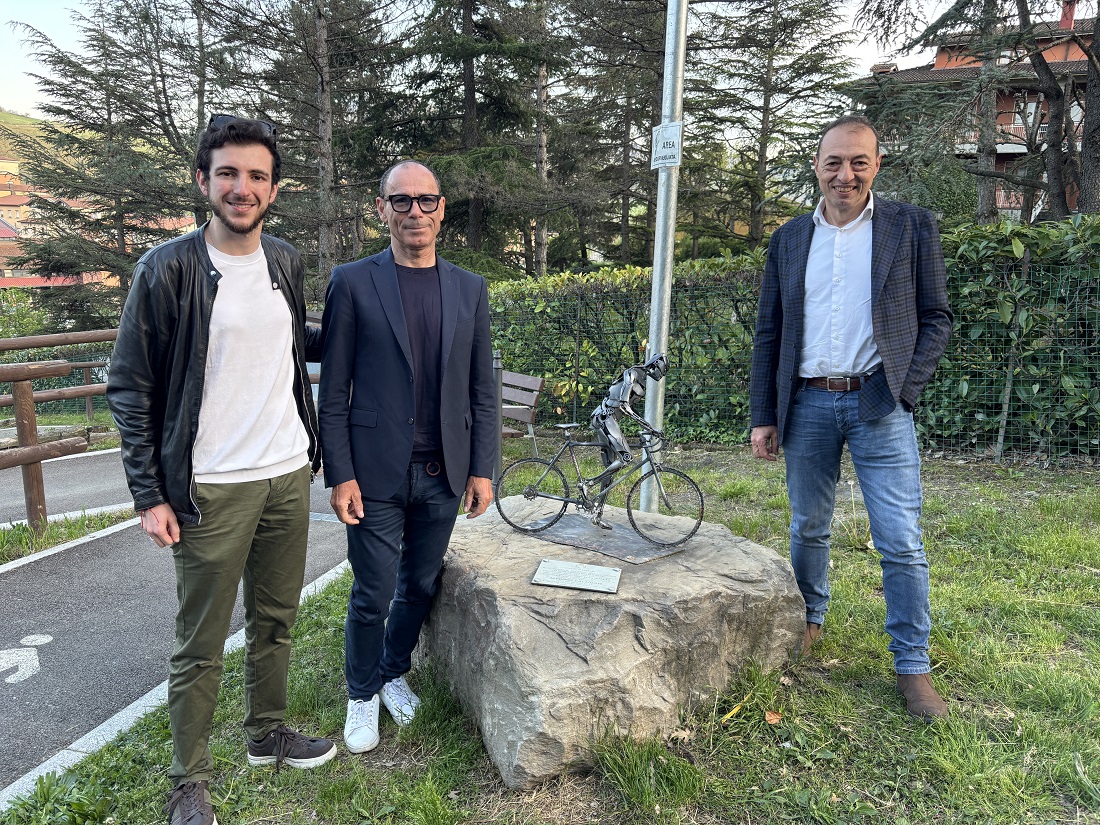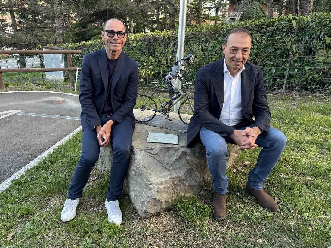 Giro d’Italia – Cassani e Conti in visita a Vergato alla scultura di Alfonso Calzolari