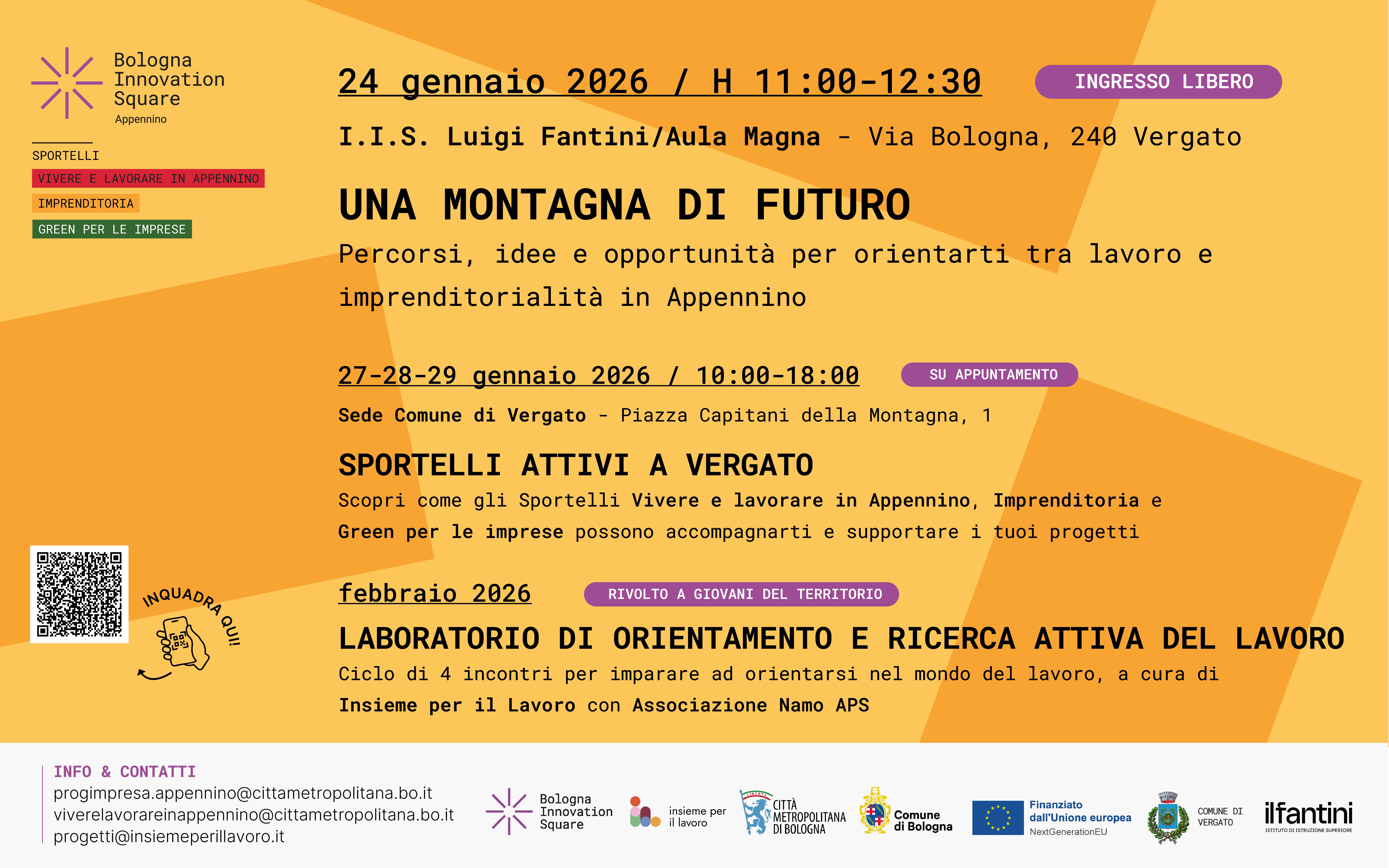 2026/01/10, Vergato – Tour dei Territori: a gennaio tappa a Vergato con “Una Montagna di Futuro”. In collaborazione con il Comune di Vergato, l’Unione dei Comuni dell’Appennino Bolognese e l’IIS Fantini di Vergato, l’iniziativa nasce per dialogare con le nuove generazioni e offrire strumenti concreti per costruire il proprio futuro professionale sul …